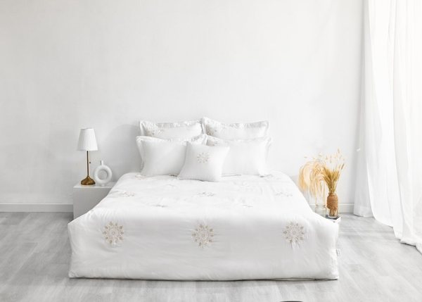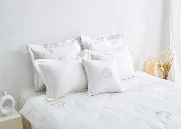 Năm nay, màu trắng được kết hợp cùng phong cách hoa văn hiện đại, cách điệu. Hình hoa tròn như bông tuyết nở, được rải đều khắp chăn, chỉ thêu kim tuyến ánh bạc lấp lánh tôn lên vẻ đẹp vừa quyến rũ, vừa sang trọng, ấn tượng.