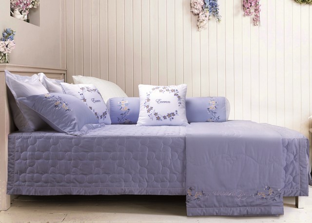 Bộ chăn ga với tông màu hot của năm 2018 - Serenity, trên nền vải tím xanh nhẹ nhàng được điểm xuyết những cành đào được thêu vô cùng sắc sảo, kết hợp những cánh đào bay khắp mặt chăn, Bộ chăn ga đem lại cảm nhận vừa mong manh, vừa nhẹ nhàng.