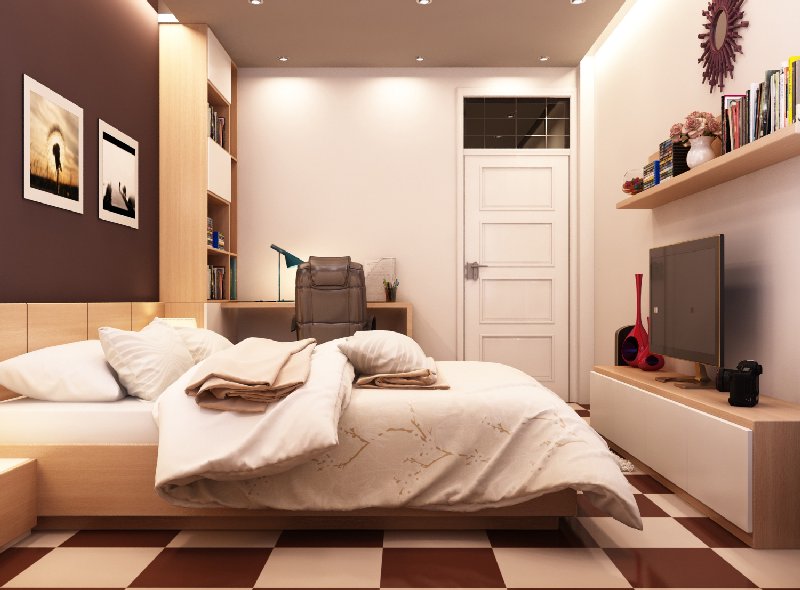 Với phòng ngủ 15 m2, bạn cần đặc biệt chú ý đến kích thước cửa phòng. Xem liệu đệm có thể đưa lọt qua cửa phòng hay không?