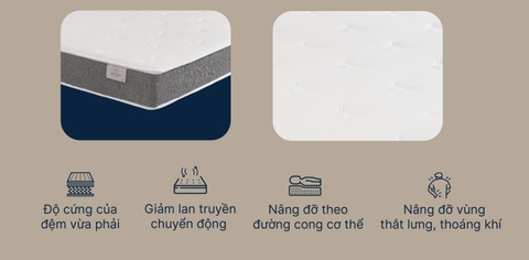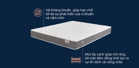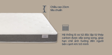 Hệ thống lò xo túi độc lập dạng thấp nâng đỡ tối ưu từng vùng cơ thể. Các cuộn lò xo được bọc trong túi vải riêng biệt hạn chế tối đa tiếng động va chạm giữa các thanh lò xo.