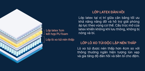 Lớp latex giúp cân bằng tối ưu khả năng nâng đỡ và hỗ trợ giải phóng áp lực theo vùng cơ thể. Cấu trúc mở của latex khiến không khí lưu thông, không bị nóng và bí.