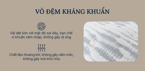 Foam PU (Poly foam), Marble foam, Rail foam, Visco foam kết hợp cùng Memory foam giúp giảm áp lực, nâng đỡ theo đường cong cơ thể. Cao su tự nhiên hỗ trợ vùng thắt lưng. Lò xo mini nằm giữa các lớp comfort với mức độ thoải mái gấp 10 lần đệm thông thường.