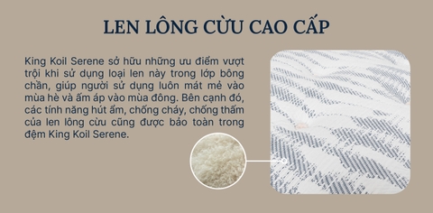 Với tính chất dẻo dai và đàn hồi cao đặc trưng của len lông cừu, người nằm luôn cảm thấy mát mẻ vào mùa hè và ấm áp vào mùa đông. Các tính năng hút ẩm, chống cháy, chống thấm cũng được bảo toàn.